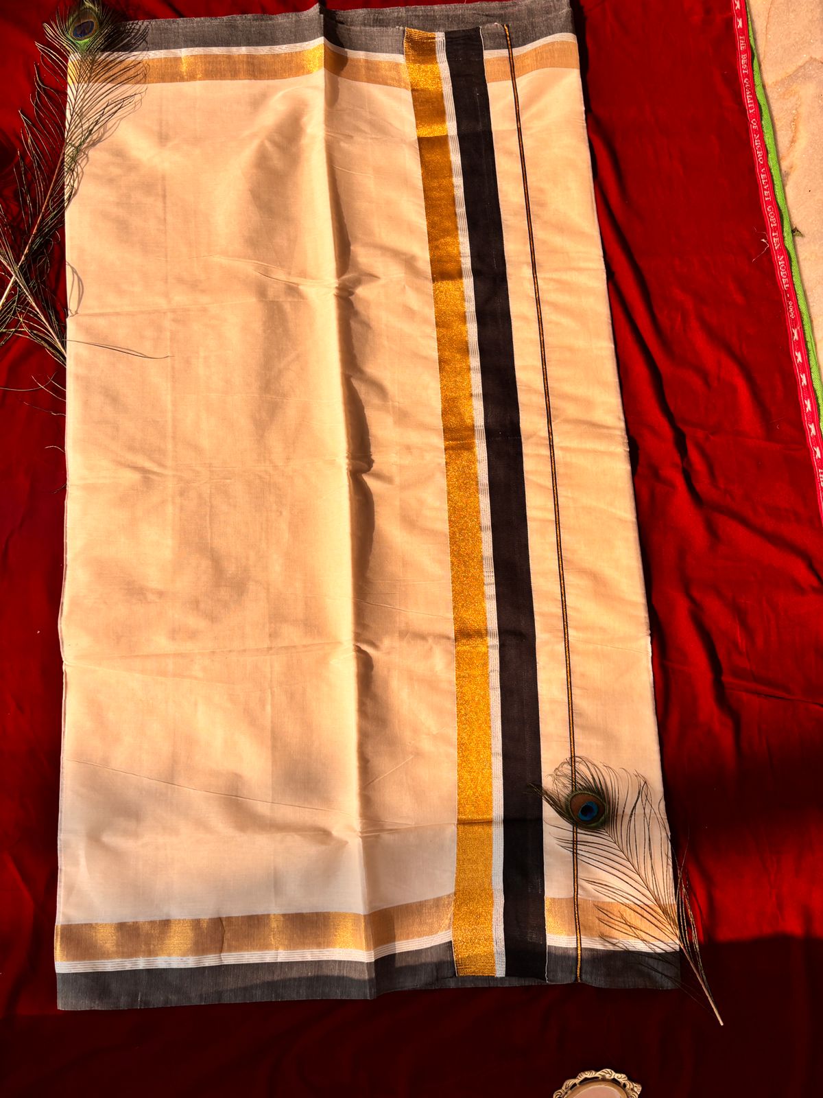 Off-white base with gold zari border